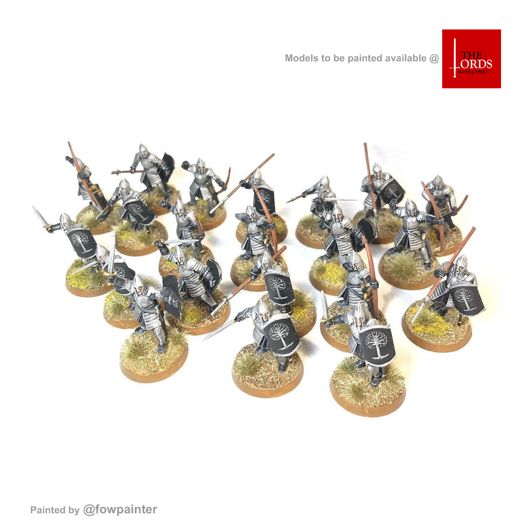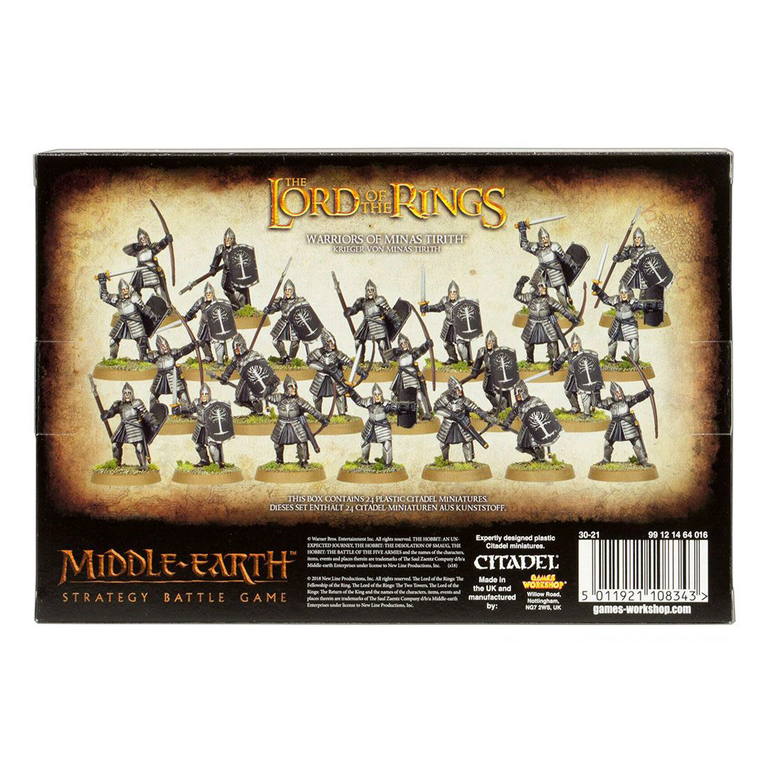Bộ mô hình nhựa này chứa 32 bộ phận, để ráp thành 24 chiến binh của Minas Tirith: 8 dùng cung, 8 với kiếm và khiên, và 8 với giáo và khiên. Bộ này còn kèm theo 24 đế tròn 25mm. Những mô hình này chưa được sơn và cần lắp ráp - chúng tôi khuyến khích bạn sử dụng keo dán nhựa Citadel Plastic Glue và sơn Citadel Paints.