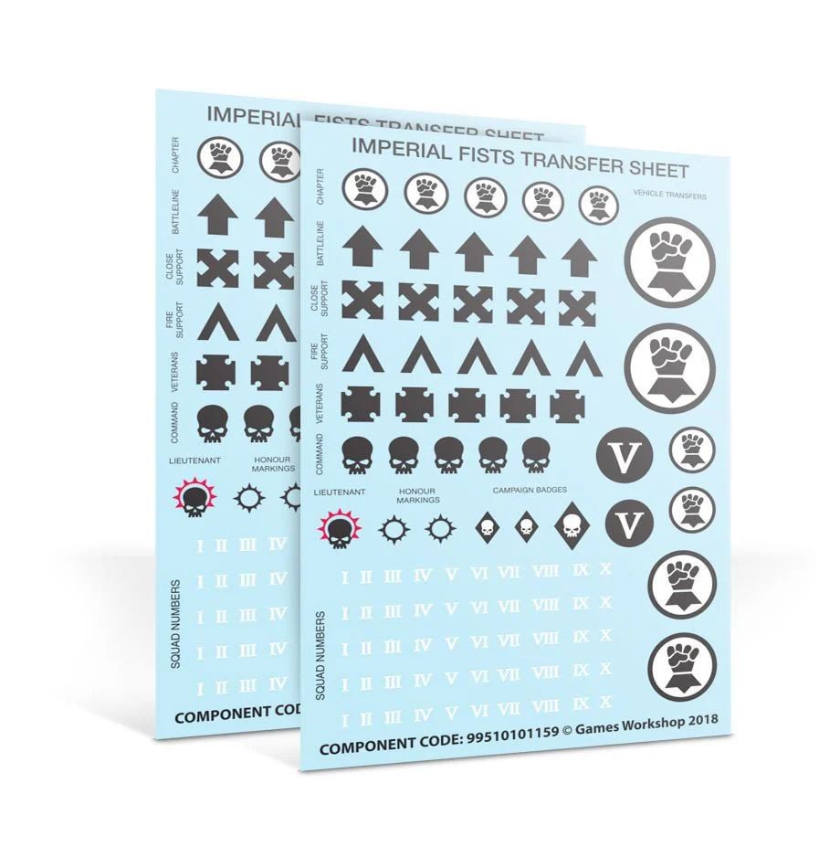 Bộ này cũng có 2 tờ đề can bao dành cho Chapter, các biệt đội và phương tiện, cũng như huy hiệu chiến dịch, số đội, cấp bậc và biểu tượng vinh danh.