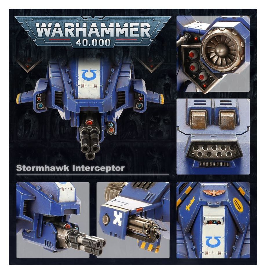 An awesome sight, descending at incredible velocities from orbiting warships to engage and annihilate enemy craft, Stormhawk Interceptors are a stunning hymn to aerial superiority that the Space Marines sing with gusto. The frontal armour and huge firepower makes them excellent dogfighters, hurtling through the clouds to execute target after target in a blazing display of incendiary defiance. Often seen in Vehemence Attack Patterns, Stormhawk squadrons and their golden haloes of flares discharged to gently dissuade incoming fire are a signal that whatever planet the skies are over, they
